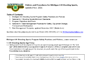 Policies and procedures for Michigan 4-H Shooting Sports programs. This document includes an updated, fillable PDF template of the required Risk Management Plan. -