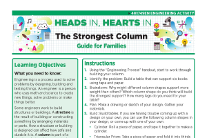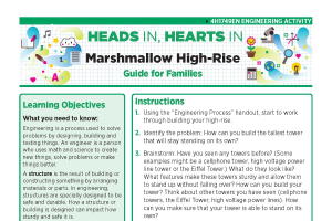Heads In, Hearts In: A Delivery Approach to Family Enrichment Programming – Engineering Activities are designed to help Michigan State University Extension staff members to involve partners in facilitating a family enrichment program around the topic of engineering education. Family enrichment programming is an approach to education that involves youth and their families learning together as they focus on a topic. This page includes the full engineering activity book containing all 16 science activities, the staff guide for tips for facilitating a family enrichment event and all 16 science activities available for download individually.