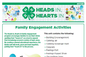 4-H's mission is to empower youth to reach their full potential, working and learning in partnership with caring adults. One goal to achieve that mission is to connect in-school learning with out-of-school-time opportunities that enhance learning. That's precisely the focus of Heads In, Hearts In: A Delivery Approach to Family Enrichment 4-H Programming. These resources encourage youth and families to use their minds (putting their "heads in") as a tool to expand their knowledge around variety of topic areas. By creating a shared educational experience, youth and their families will work, grow and learn together, putting their "hearts in" to the process.
