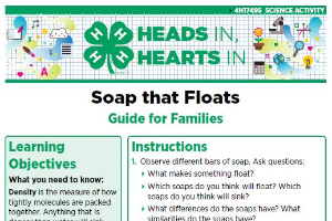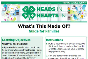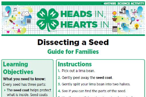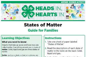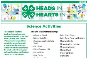 4-H's mission is to empower youth to reach their full potential, working and learning in partnership with caring adults. One goal to achieve that mission is to connect in-school learning with out-of-school-time opportunities that enhance learning. That's precisely the focus of Heads In, Hearts In: A Delivery Approach to Family Enrichment 4-H Programming. These resources encourage youth and families to use their minds (putting their "heads in") as a tool to expand their knowledge around variety of topic areas. By creating a shared educational experience, youth and their families will work, grow and learn together, putting their "hearts in" to the process.