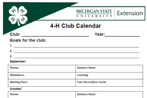 This 4-H Club calendar helps your club stay organized by outlining meetings and activities. It gives members a clear picture of what to expect, helps with planning, and keeps your club running smoothly. -