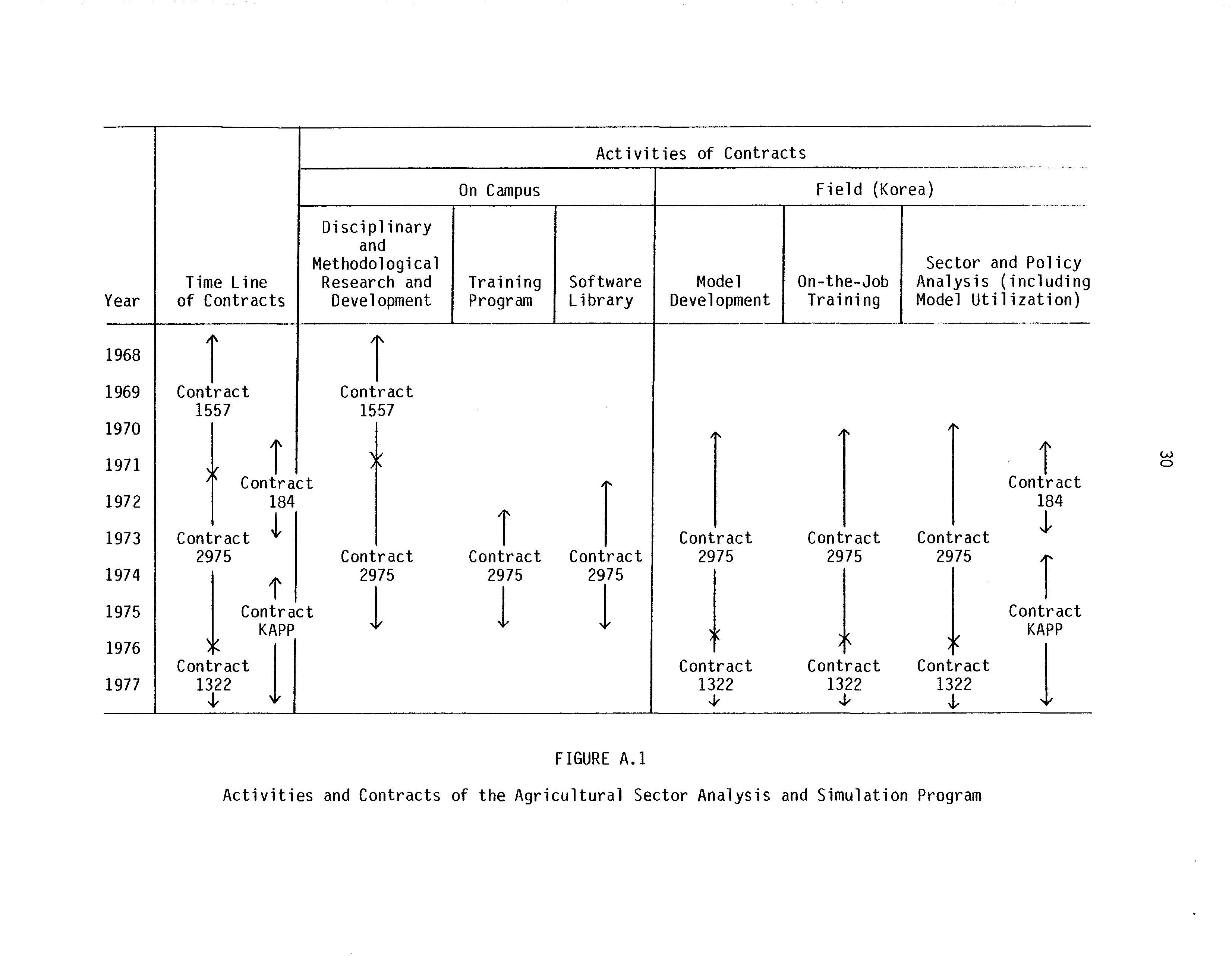 Also in 1971, at the request of the Korean government and the AID mission in the Republic of Korea, ASASP at MSU entered into another contract (AID/ead-184 - Korean Agricultural Sector Simulation Model) for a one-year project to perform an agricultural sector analysis and an investment priorities study. Recognizing the complementarities of the two projects, ASASP undertook its Contract 2975 field activities in Korea, which came to be known as KASS - The Korean Agricultural Sector Study. Indeed, those complementarities, primarily the use of the preliminary simulation model developed during that first year under Contract 2975, enabled completion of the sector analysis within the prescribed time limit under Contract 184.