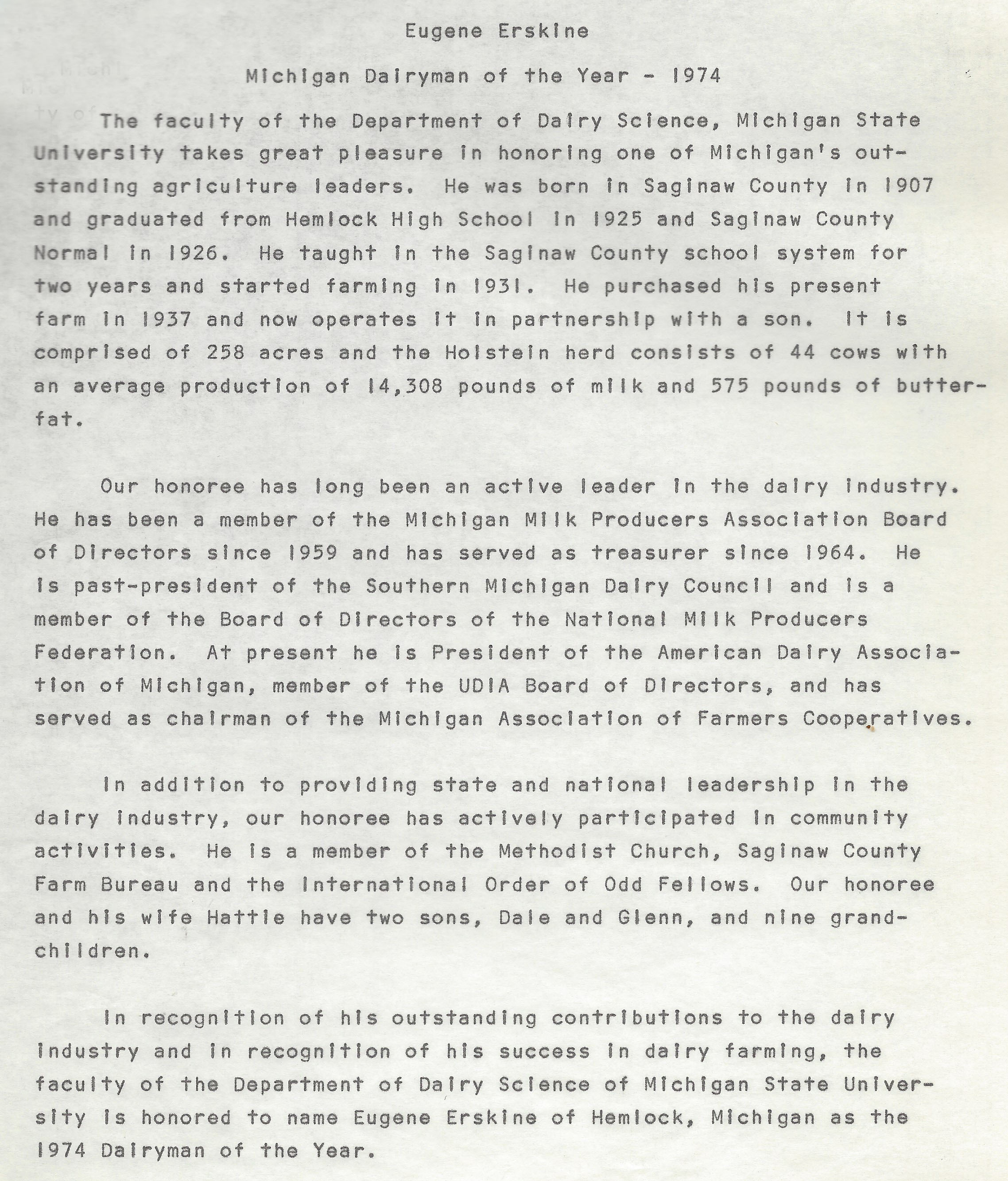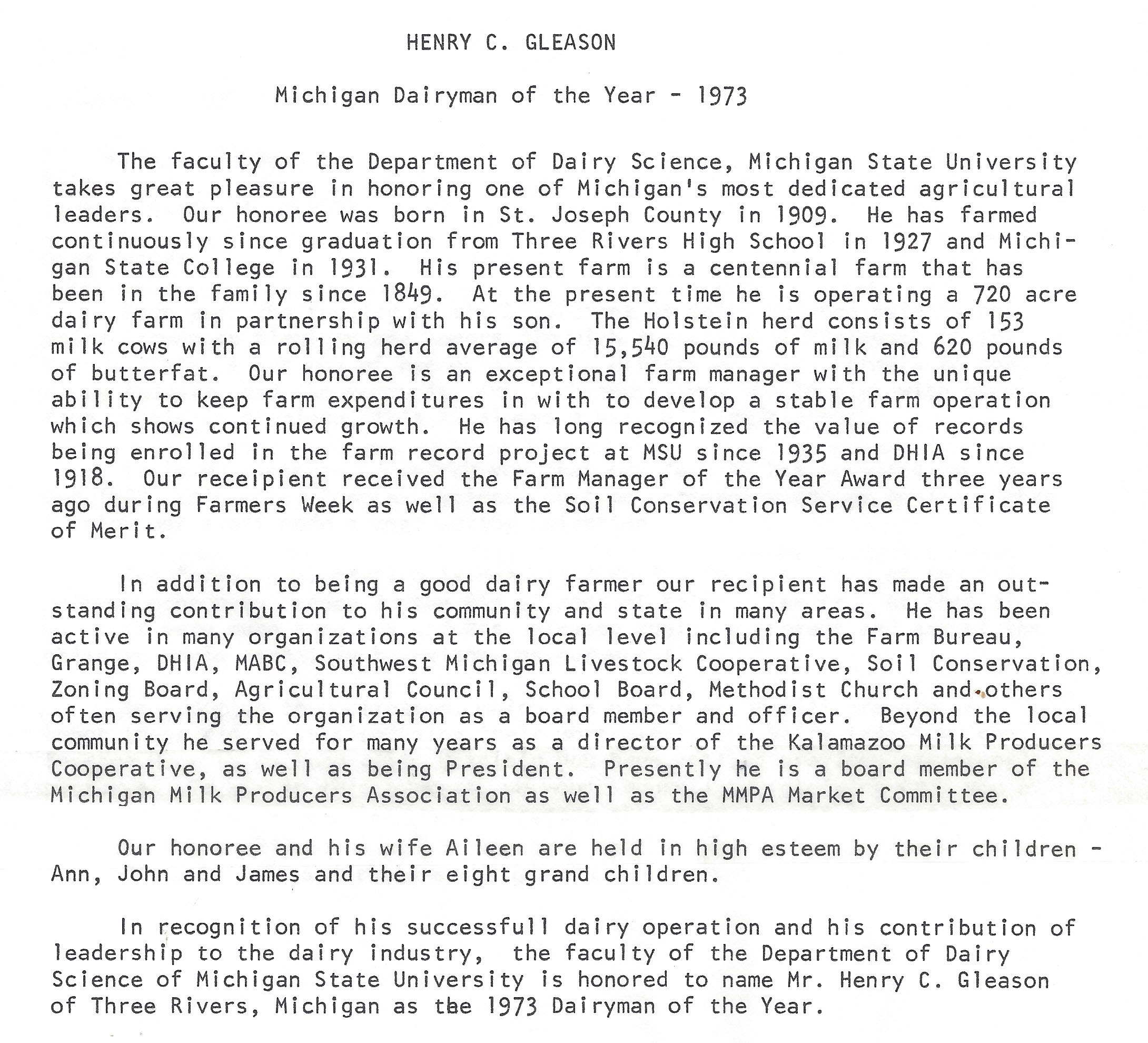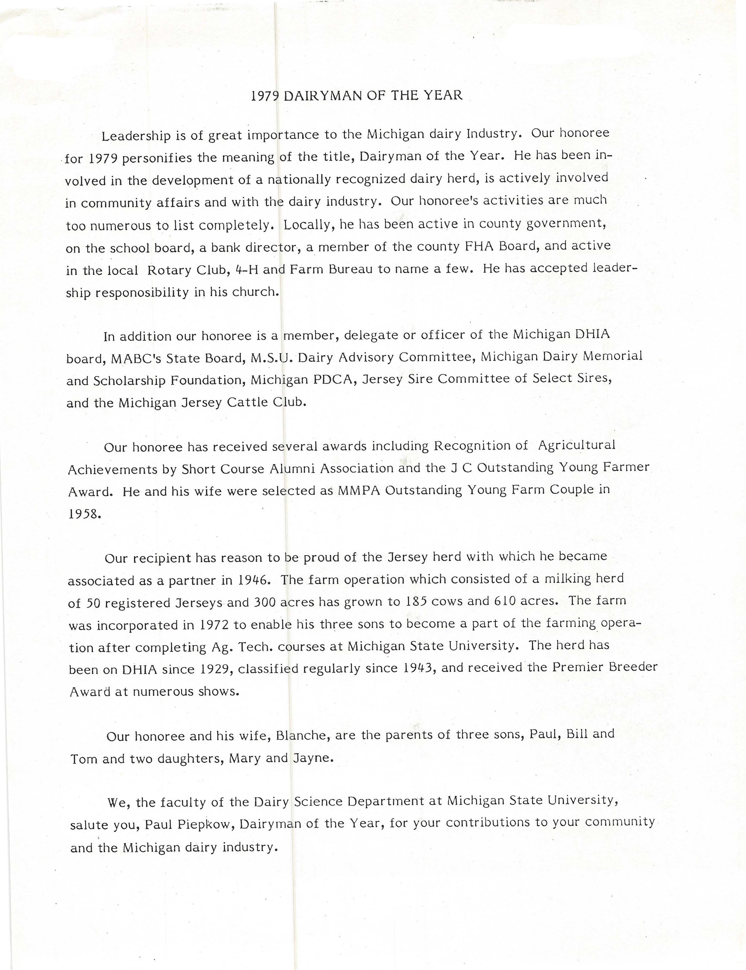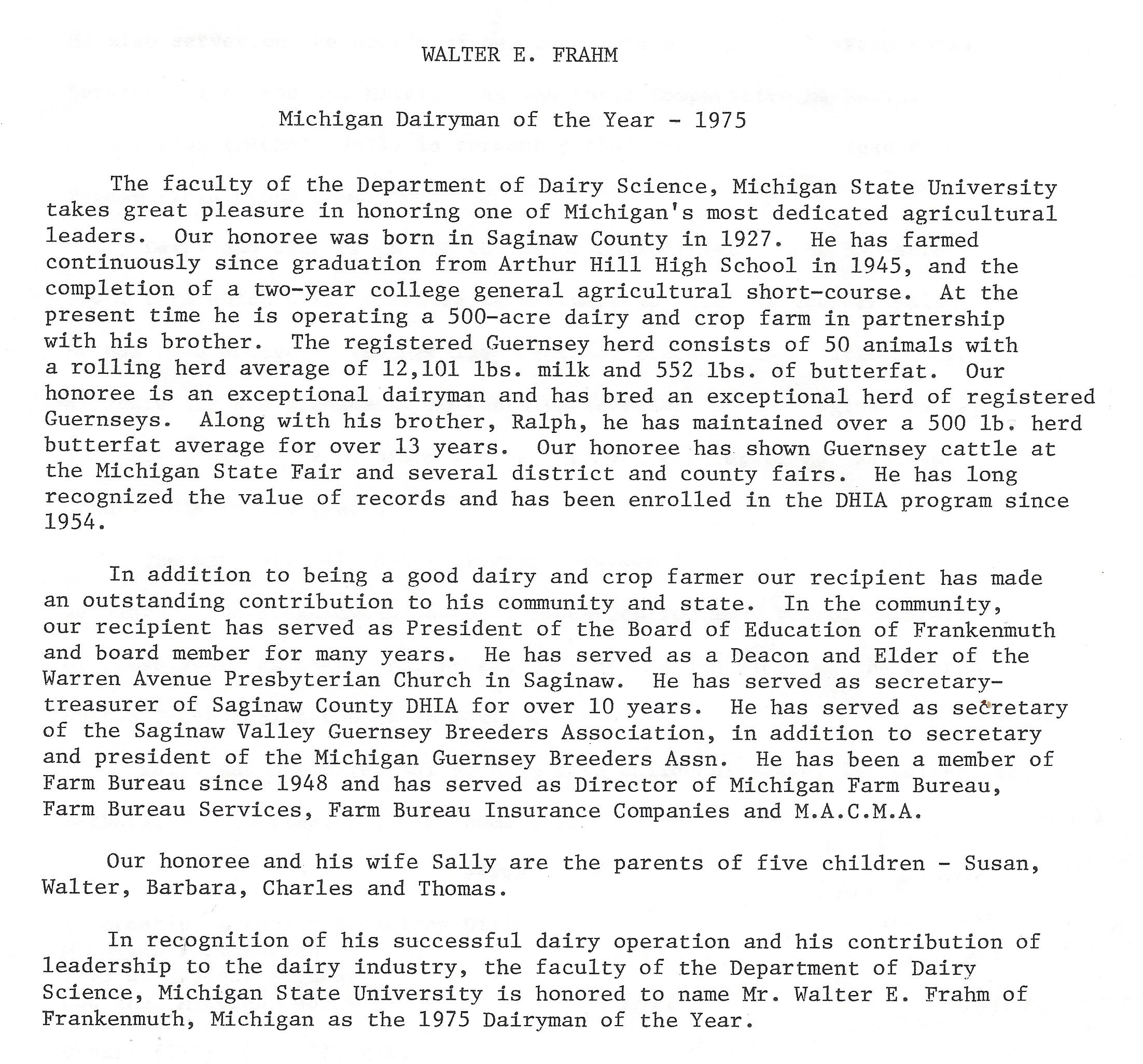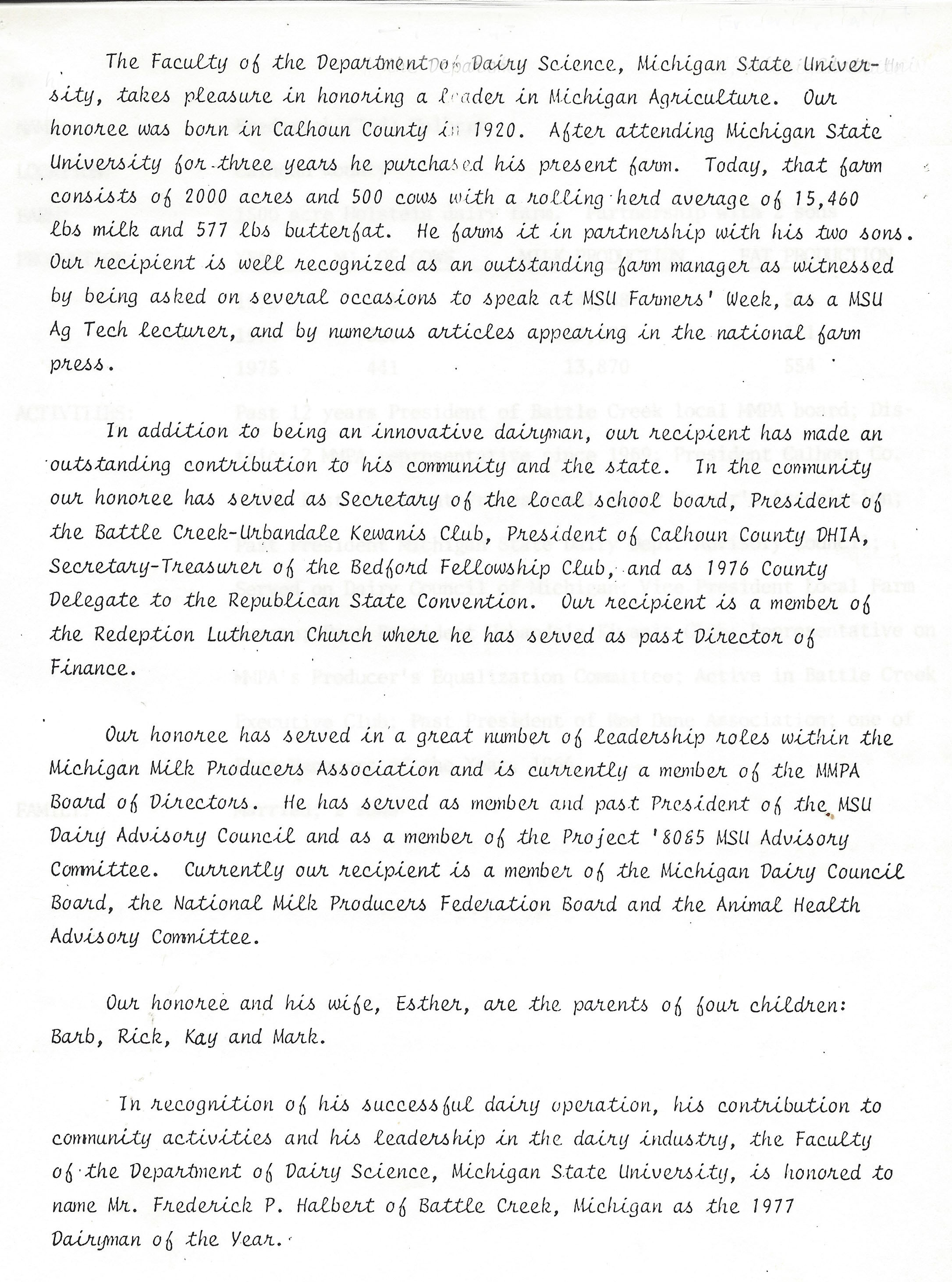 The following Dairy Farmer of the Year descriptions are copies of the letters used in the year of award. At this time, only images of the letters are available.