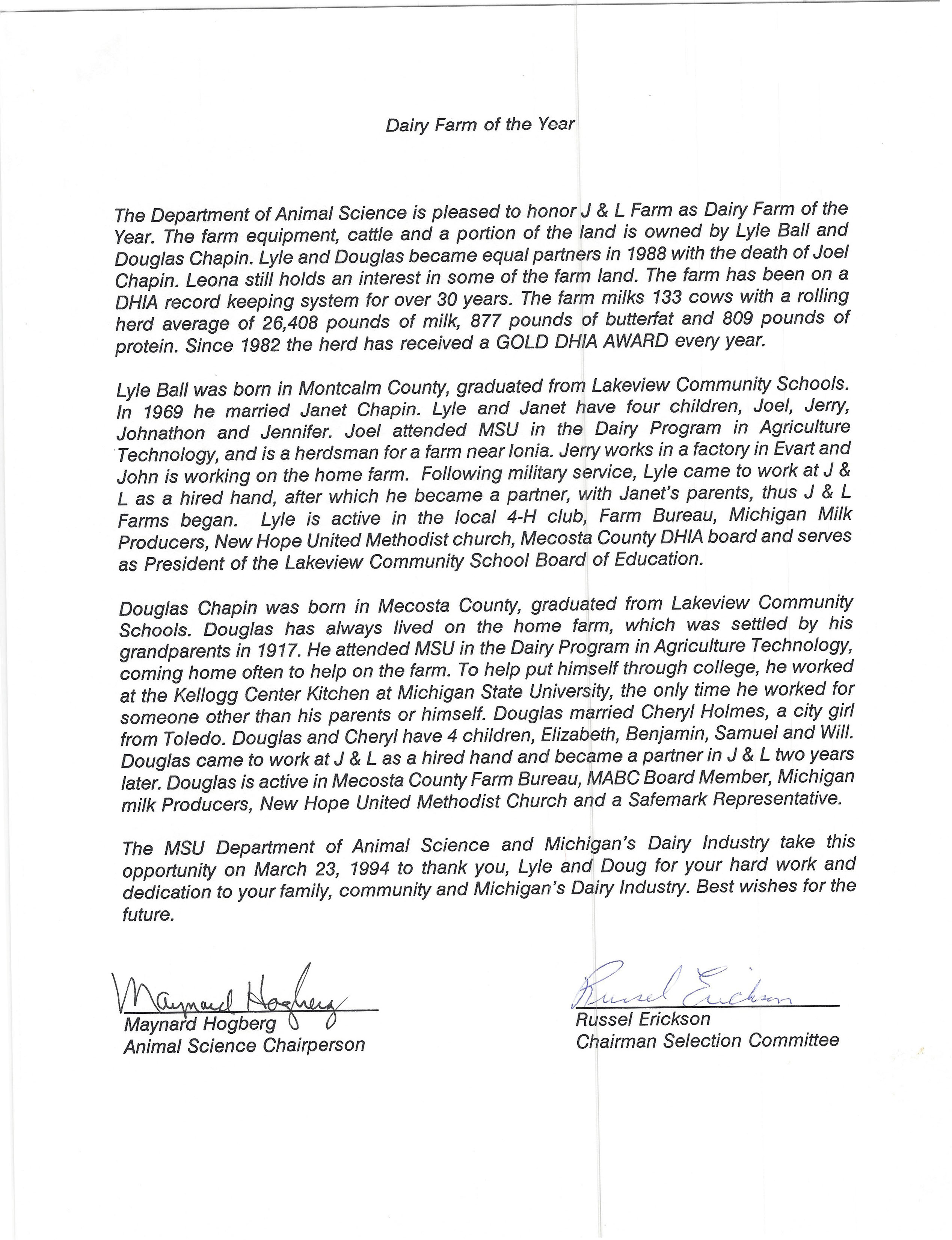 The following Dairy Farmer of the Year descriptions are copies of the letters used in the year of award. At this time, only images of the letters are available.
