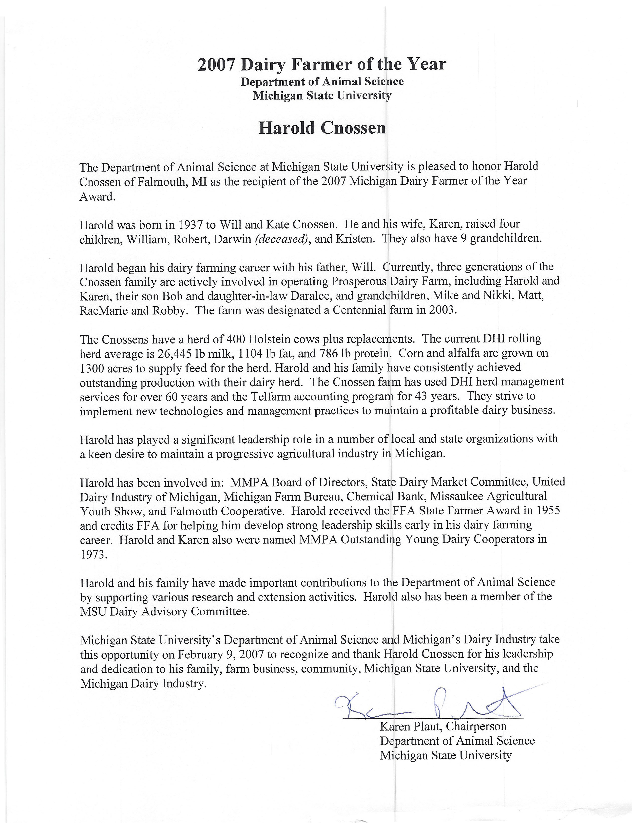 The following Dairy Farmer of the Year descriptions are copies of the letters used in the year of award. At this time, only images of the letters are available.