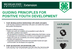 Creating ways for youth to learn and practice the Michigan 4-H Guiding Principles will lead to greater growth and success in their 4-H involvement. -