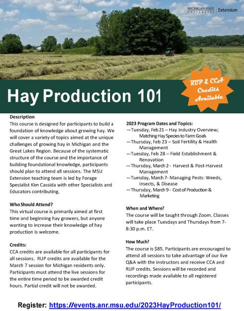 This course is designed for participants to build a foundation of knowledge about growing hay. We will cover a variety of topics aimed at the unique challenges of growing hay in Michigan and the Great Lakes Region. Because of the systematic structure of the course and the importance of building foundational knowledge, participants should plan to attend all sessions. The MSU Extension teaching team is led by Forage Specialist Kim Cassida with other Specialists and Educators contributing.