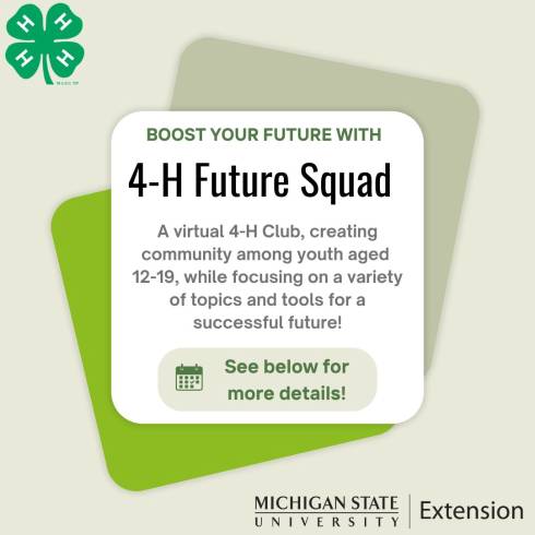 More information and a form to complete to get registration details can be found at: https://www.canr.msu.edu/4-h-future-squad/