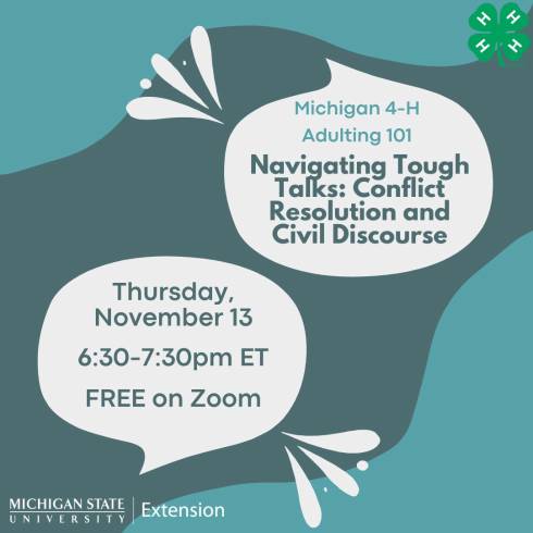 Are you ready to leave for college or be out on your own? Are you prepared to do the adult tasks of managing your finances, home, health, or finding a career? Zoom in for FREE to learn real life skills to help you successfully transition to living independently. This session is part of the Michigan 4-H Adulting 101 webinar series.