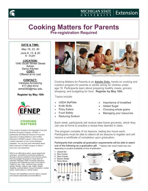 Cooking Matters for Parents is an Adults Only, hands-on cooking and nutrition program for parents or adults caring for children under age 18. Participants learn about preparing healthy meals, grocery shopping, and budgeting for food. Register by May 10th.