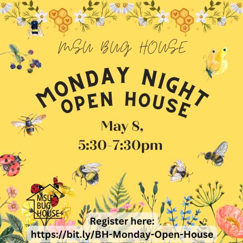 The MSU Bug House will be open on Monday, May 8 from 5:30-7:30 pm for a free open house event. All are welcome. Learn about insects as you view our amazing specimen displays and interact with our menagerie of friendly live insects! Please register in advance using the link below.