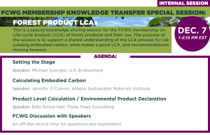 This is a special knowledge sharing session for the FCWG membership on Life-cycle Analysis (LCA) of forest products and their use.