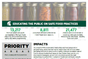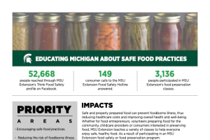 As a result of MSU Extension’s food safety and food preservation programming, adults learned how to reduce their risk of illness when preparing food and to preserve food safely. -