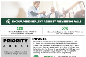 As a result of MSU Extension’s disease management and falls prevention programming, participants learned to: prevent and manage their chronic health conditions, prevent falls, improve communication and increase their knowledge of healthy eating. -