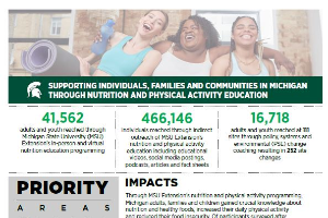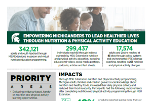 Through MSU Extension’s nutrition and physical activity programming, Michigan adults, families and children gained crucial knowledge about nutrition and healthy foods, increased their physical activity and reduced their food insecurity. -