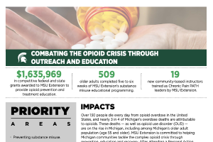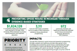 Through MSU Extension’s opioid misuse and prevention programming, Michigan residents and healthcare providers alike gained crucial knowledge about preventing opioid misuse and understanding the signs and symptoms of opioid use disorder. -