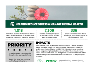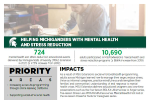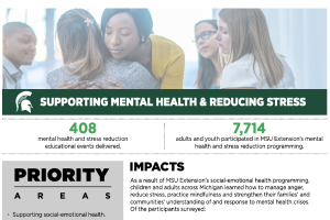 As a result of MSU Extension’s social-emotional health programming, adults across Michigan learned how to manage their anger, reduce stress, thrive as informal caregivers, practice mindfulness and strengthen their understanding of mental health crises. -