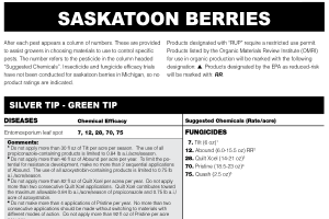 This resource can assist saskatoon growers in choosing materials to use to control specific pests. -