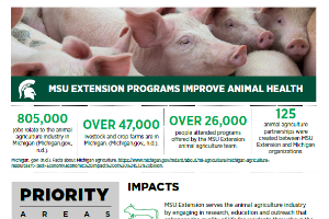 Michigan State University Extension provides valuable services, programs and information for Michigan’s animal agriculture industry by engaging in research, education and outreach that addresses animal health concerns directly on the farm.