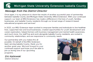Michigan State University Extension is proud to serve people in Isabella County with programs supporting youth, strong communities, healthy families, and our natural resources.