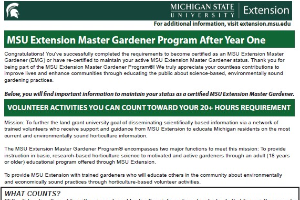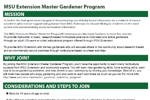 The EMG tip sheet for first year EMGs contains basic information to guide both the public who may be interested in becoming an MSU Extension Master Gardener and as a reminder of basic information for EMGs who are in their first year of the program. -