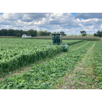 Mowing sorghum-sudan cover crops for livestock feed (B. Wilke, Sep 2022)