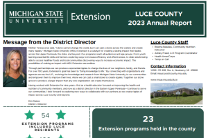 Michigan State University Extension is pleased to make information available to you. Our purpose is to provide educational programs and assistance in Agriculture and Natural Resources, Children, Youth and Family, and Community and Economic Development. If we can be of further assistance, please contact us. You can also view our most recent annual report for more information below:
