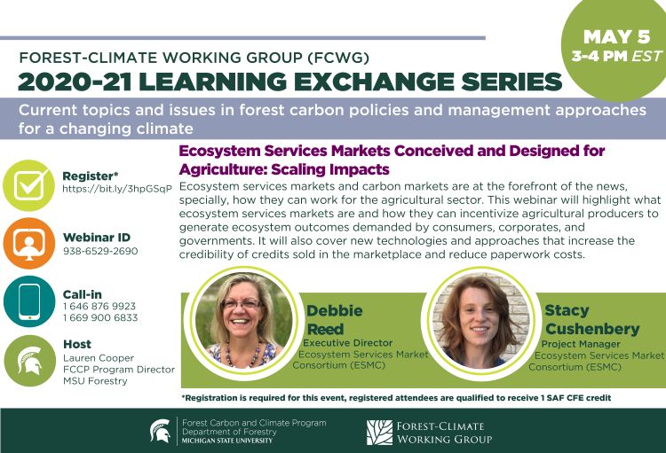In this webinar, speakers Debbie Reed and Stacy Cushenbery of Ecosystem Services Market Consortium will present "Ecosystem Services Markets Conceived and Designed for Agriculture: Scaling Impacts."
