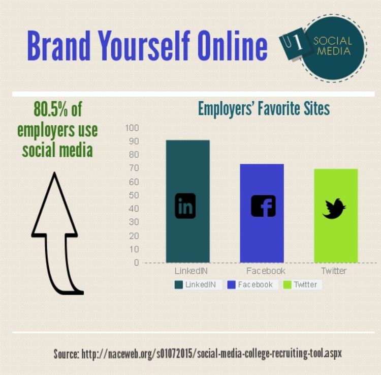 If you are looking for an internship, job or even a promotion, you need to decide how you want to be portrayed online. Have you ever “googled” yourself or your business? Make sure to search your name, email and phone number. Employers will. In a recent study, 80.5 percent of employers are using social media in some capacity. Employers use social media as a recruitment tool by searching for and contacting potential candidates. They also use it as a potential screening tool, reviewing information on the candidate’s profile. According to a 2014 NACE survey, the social media sites used most by employers responding to the survey were LinkedIn (92.6 percent), Facebook (73 percent) and Twitter (69.4 percent).