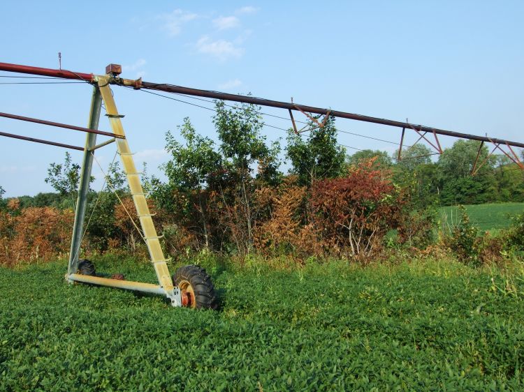 One of the greatest potential economic losses from center pivot irrigation comes from trees collapsing or rolling the spans. When irrigation equipment is installed near field edges, tree lines are usually trimmed back so they do not interfere with the equipment. Tree limbs as small as two inches in diameter can cause a pivot tower to flip or tear off the pivot end boom if branches catch the span V bracing or end gun. Tree branches can also act like a chain anchored to the ground and cause the pivot span to roll causing the structure to collapse.