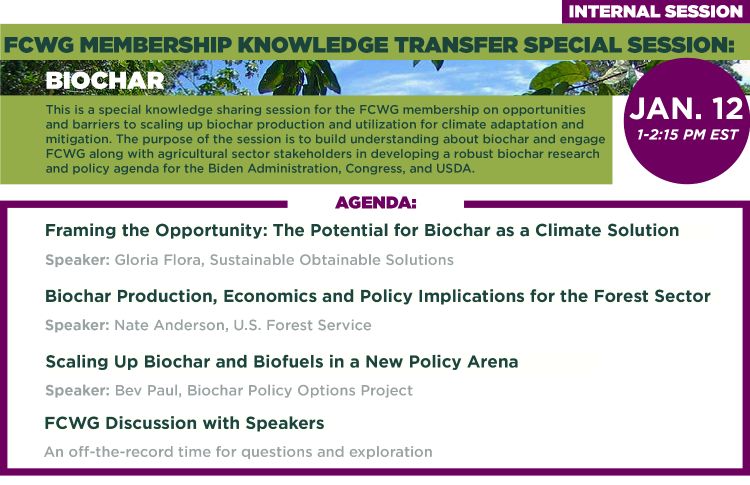 This is a special knowledge sharing session for the FCWG membership on opportunities and barriers to scaling up biochar production and utilization for climate adaptation and mitigation. The purpose of the session is to build understanding about biochar and engage FCWG along with agricultural sector stakeholders in developing a robust biochar research and policy agenda for the Biden Administration, Congress, and USDA.