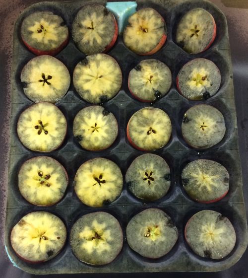 Mixed maturity indicated by iodine staining variability in Gale Gala. Photo by Amy Irish-Brown, MSU Extension.