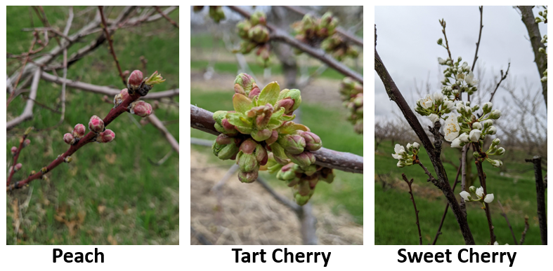 Peach, tart cherry and sweet cherry buds in Sparta, Michigan, on May 2. Photo by Anna Wallis, MSU Extension.