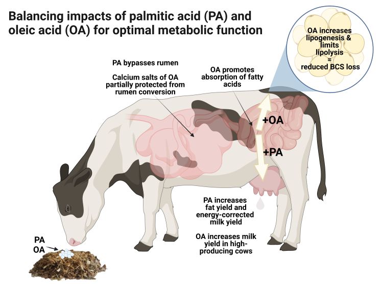 Feeding fat supplements that are 60% PA and 30% OA can positively impact the transition cow by regulating the balance between increasing milk production parameters and sustaining body weight in this critical period. This information is important for dairy producers and nutritionists when feeding fat supplements to fresh cows to help meet energy demands and increase yields of milk and milk components. We are still working to fully understand the mechanisms linking supplemental OA to improved milk production, increased FA digestibility, and altered energy partitioning.