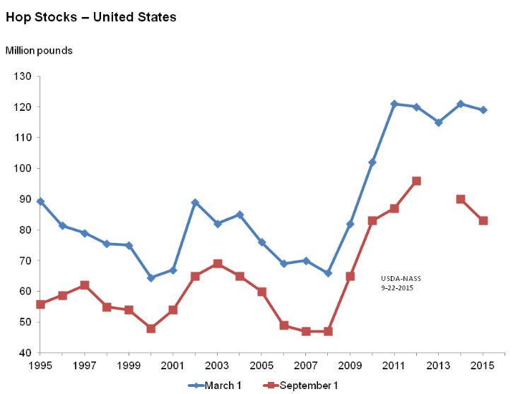 The USDA National Agriculture Statistics Service recently released the September Hop Stocks report. The report suggests that current U.S. hop inventory (held by growers, dealers, and brewers) is 8 percent lower compared to the same time in 2014. The overall inventory held by growers, dealers, and brewers was approximately 83 million pounds. Interestingly, brewer’s inventory was 14 percent lower than in 2014, while dealers and grower holdings were down 2 percent. These data do not account for production outside of Washington, Oregon, and Idaho.