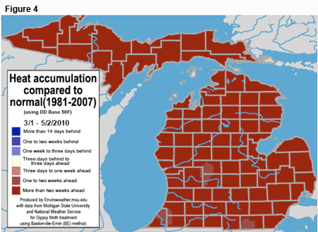 You will be taken to the degree-day maps. The map at the top of the page shows current degree-day accumulations (base 50) throughout the state. If you scroll down the page, the second map will display departures from normal. Figure 3 shows what this map looks like as of May 2, 2011. Most of the state is 1 to 2 weeks behind normal degree-day accumulations. Contrast this with the same map for one year ago (May 2, 2010), when most of the state was 1 to 2 weeks ahead of normal (Figure 4). Compared with last year, field operations may be as much as two to three weeks behind.