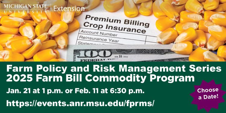 The Farm Policy and Risk Management Series is a free program presented by Michigan State University Extension. To participate, registration is required. To register today, visit: https://events.anr.msu.edu/fprms/.