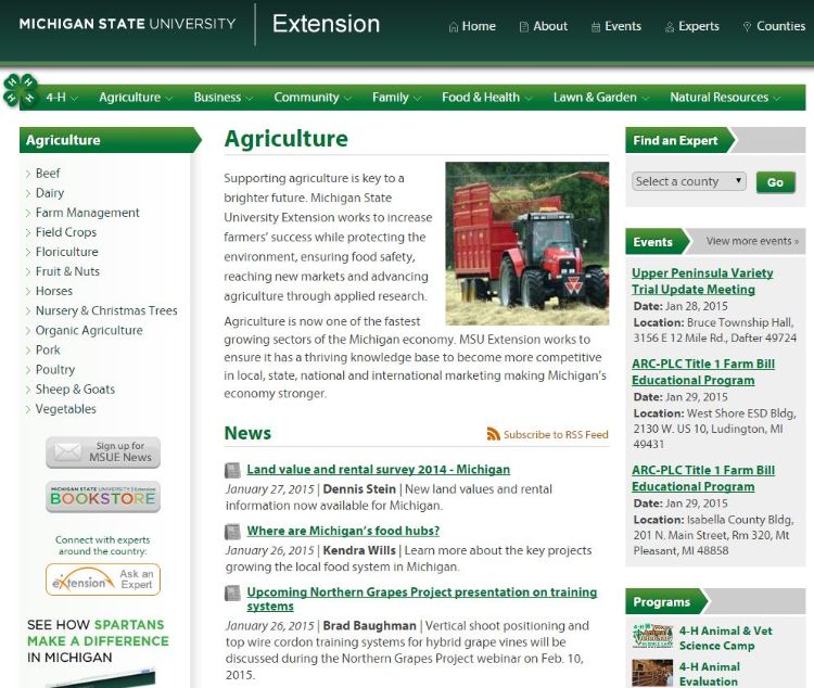 To view MSU Extension News, go to http://msue.anr.msu.edu and click on the “Agriculture” tab. You will be brought to a page devoted to showcasing the most recent news articles, bulletins, upcoming events and updates related to Agriculture in general. If you click on any of the tabs on the left-hand side of the page, you will be taken to another section of the website devoted to categorizing information related to that very topic. In the winter you will see all of the upcoming meetings, and in the summer you will see in-season crop updates and Enviro-weather reports from around the state.