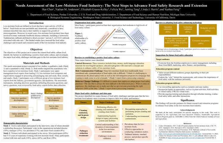 Low-moisture food safety is getting attention due to increasing foodborne recalls and outbreaks. However, limited studies have assessed the food safety challenges and research and extension need of the low-moisture food industry.