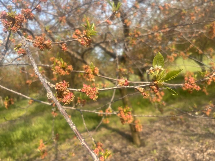We have observed some unusual development in tart and sweet cherries in orchards around the region (Photos 2 and 3). The trees appear to be extremely slow to grow, and leaves are not growing but at the tips of the branches. Many buds have not opened giving the branch a blank appearance. The leaves that are growing are distorted, darker in color and almost crinkly in appearance. There is also a lot of blossom blast in tart cherries. The flowers and shucks look red/brown on the tree are not falling. There are no fruit emerging from these flowers but still are not falling.