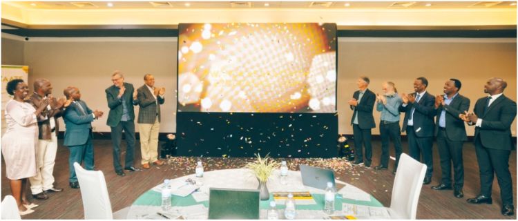 Officials and scientific research leaders launch the Rwanda Agricultural Biotechnology Program on October 11, 2024, in Kigali, Rwanda. David Douches is pictured to the right of the screen.