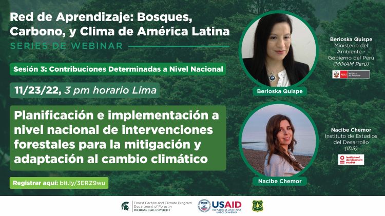 En este series de webinar, oradores Berioska Quispe y Nacibe Chemor presentan "Planificación e implementación a nivel nacional de intervenciones forestales para la mitigación y adaptación al cambio climático."