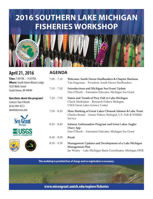 The Southern Lake Michigan Fisheries Workshop will be held 7 p.m. to 9:30 p.m. April 21 at the South Haven Moose Lodge (1025 Wells St., South Haven, MI 49090. Full details are available on this program flier.