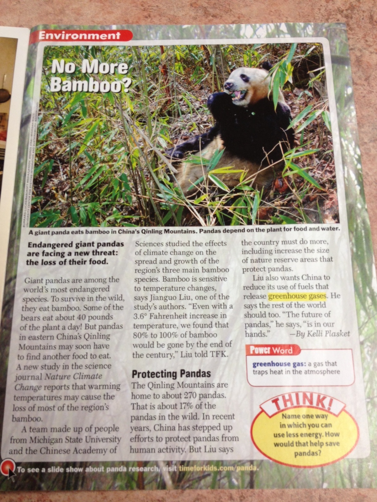 In the Jan. 11 edition of Time For Kids, Jack Liu talks about the November 2012 publication showing indicating climate change threatens bamboo in China.