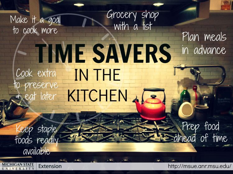There are a variety of reasons why the amount of meals eaten away from home has increased over recent decades. As the average American continues to consume multiple meals at restaurants, fast food or take-out establishments each week, there are ways to combat these habits. There are several time saving tips that can be incorporated into home kitchens, which can lead to more meals being prepared and eaten at home. Working parents, kid’s busy schedules and active adult volunteer commitments can all lead to more trips for take-out or the drive-through. Eating at home has great benefits both nutritionally as well as for the family unit. What time saving tips are you willing to try? Michigan State University Extension encourages you to read the ideas below and think about which tips could work for you and you family.