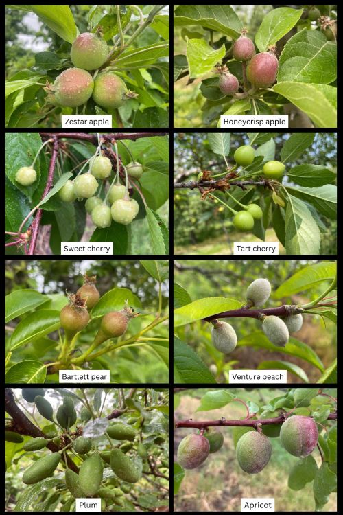 A storm front brought cooler weather on June 9 this week. Fruitlets are growing steadily, and growth rates have been very dependent on weather. Warm weather last week led to fruitlets growing about 1 millimeter (mm) per day or more. Cooler temperatures this week have slowed growth rates slightly compared to last week. Tart cherry, sweet cherry and peach have set well in many orchards across the region. Apples and pears are sizing well and some varieties like Gala have a heavy set in many orchards (Figure 1). June drop is starting in early cherry varieties.