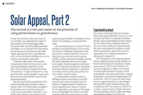 Stallknecht, E.J. 2023. Plant growth and development under experimental transparent photovoltaic and red-fluorescent greenhouse coverings. PhD diss., Dept. of Hort., Mich. State Univ., East Lansing, MI.