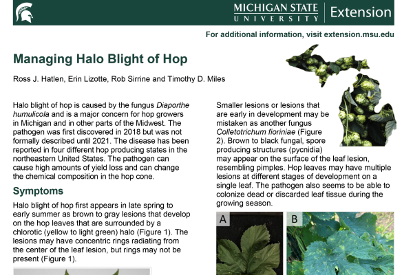 6. Higgins, D., Hatlen, R.J., Byrne, J., Sakalidis, M., Miles, T.D.. Hausbeck, M. 2021. Etiology of halo blight in Michigan hopyards. Plant Disease. 105:859-872.