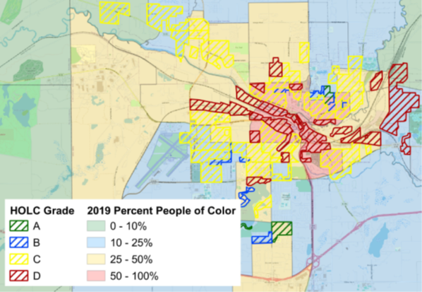 The federal government redline mapped Battle Creek in 1936. Consistent with the requirements of the government Underwriting Manual, the redline mapping specifically targeted residents of color, deeming their neighborhoods as “hazardous” to investment because they had residents of color or were even near residents of color. The original redlining map is shown below. While HOLC did not itself implement these redlining maps, it promoted these practices and showed private industry groups and the FHA how to reproduce these maps. We also have a map overlaying the original HOLC boundaries on 2019 segregation, which starkly show the continued effects of these racist practices. The strong visual connection between original HOLC grades and present-day racial segregation, shows a legacy of redlining on present-day outcomes.