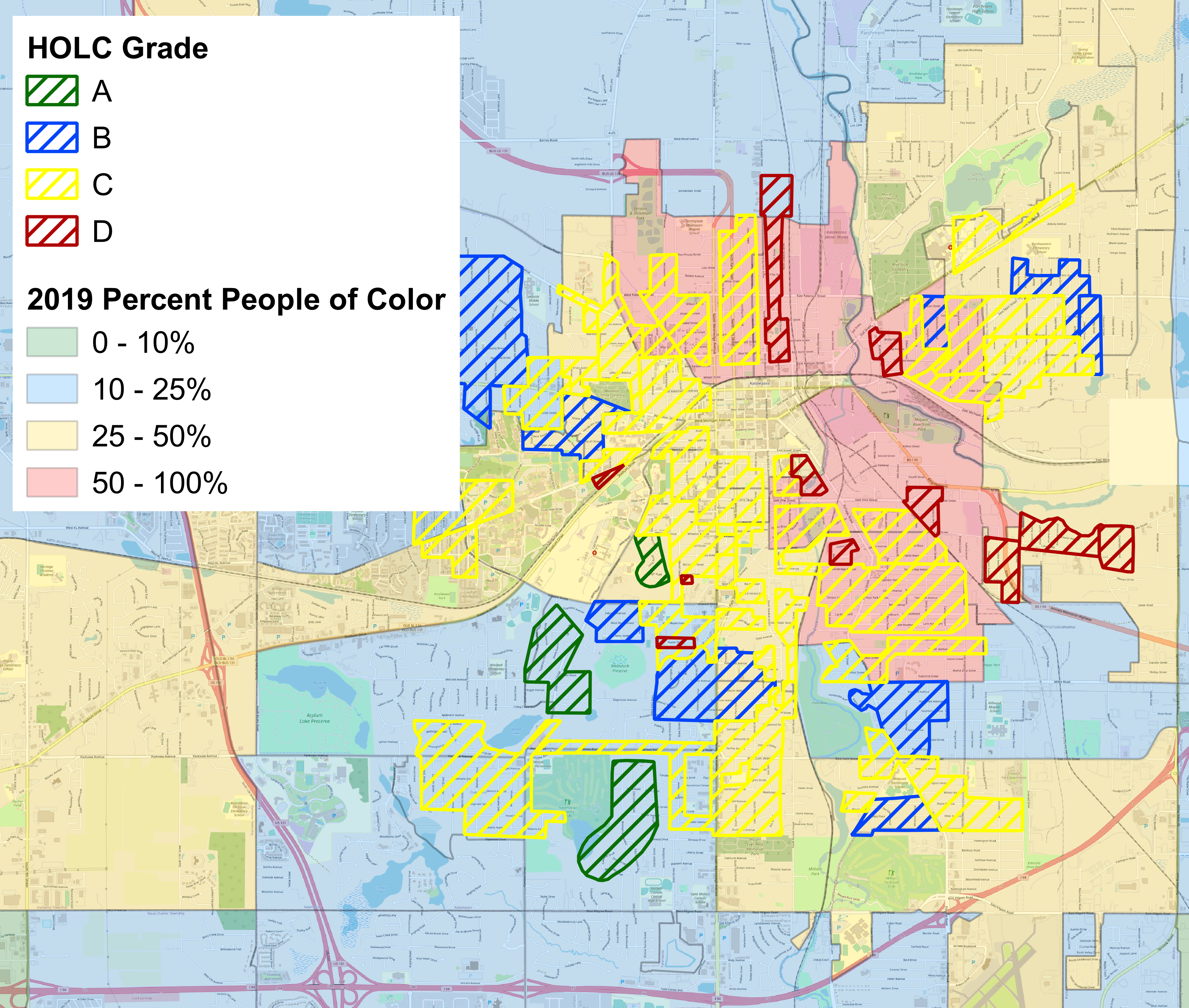 We overlay the historical HOLC “redlining” map on present-day demographic data to show the persistence and continued relevance of these racist policies on present-day segregation. We mirror the racist HOLC color gradation to help visualize the continued segregation, as a lasting impact of redlining.